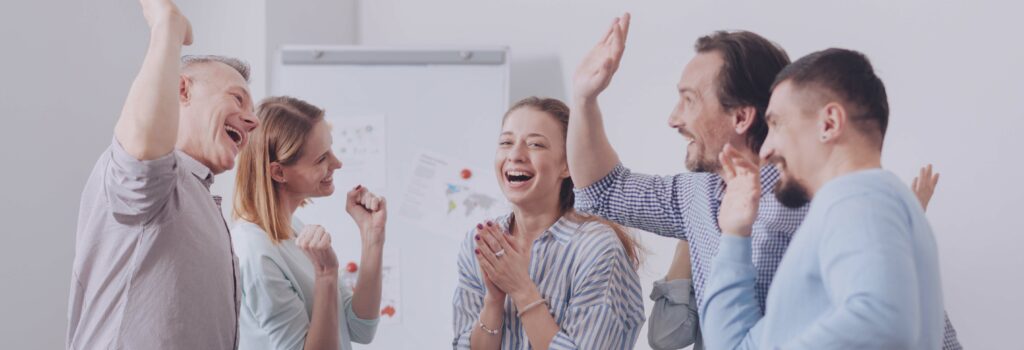 Be joyful. Team of successful people keeping smile on their faces posing on camera while men rising hands